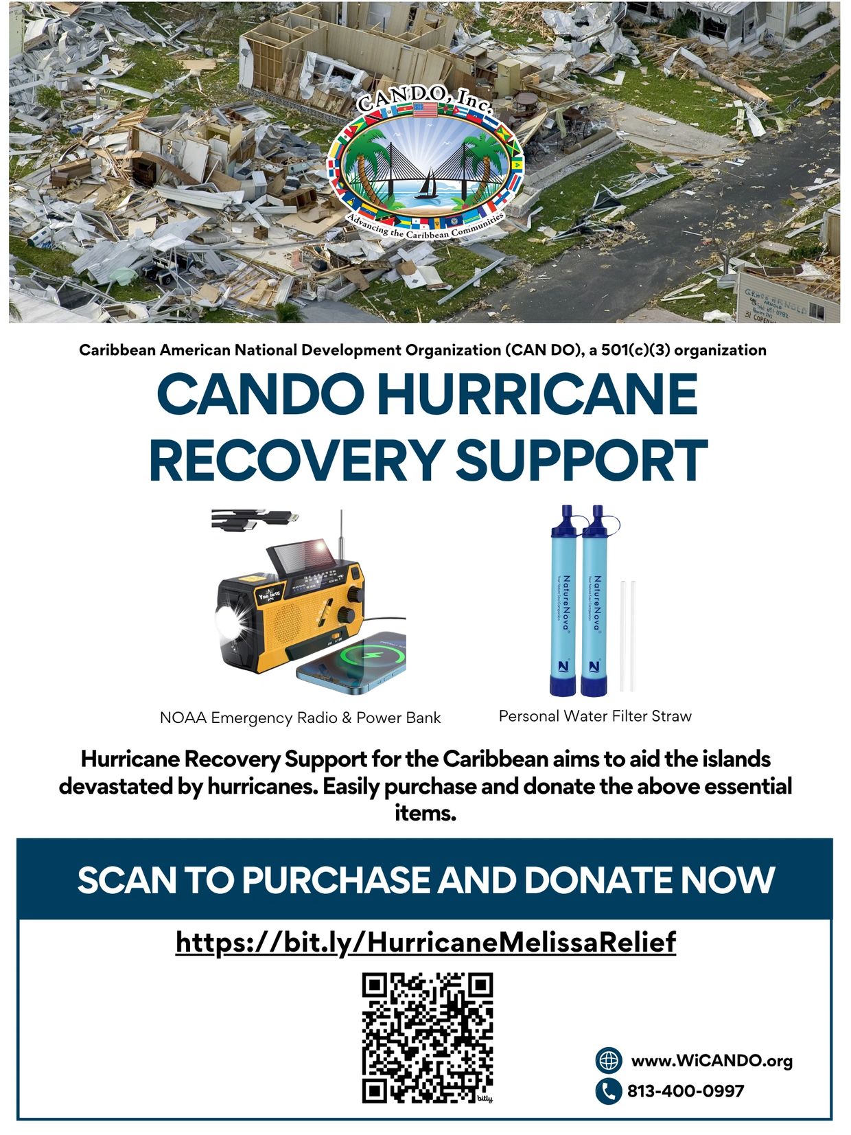 As Hurricane Melissa approaches the Caribbean, Caribbean American National Development Organization (CANDO) is mobilizing to support families and communities who are impacted by the storm. Our mission is to provide immediate relief and ongoing recovery support to those facing displacement, loss of power, and limited access to clean water and resources.